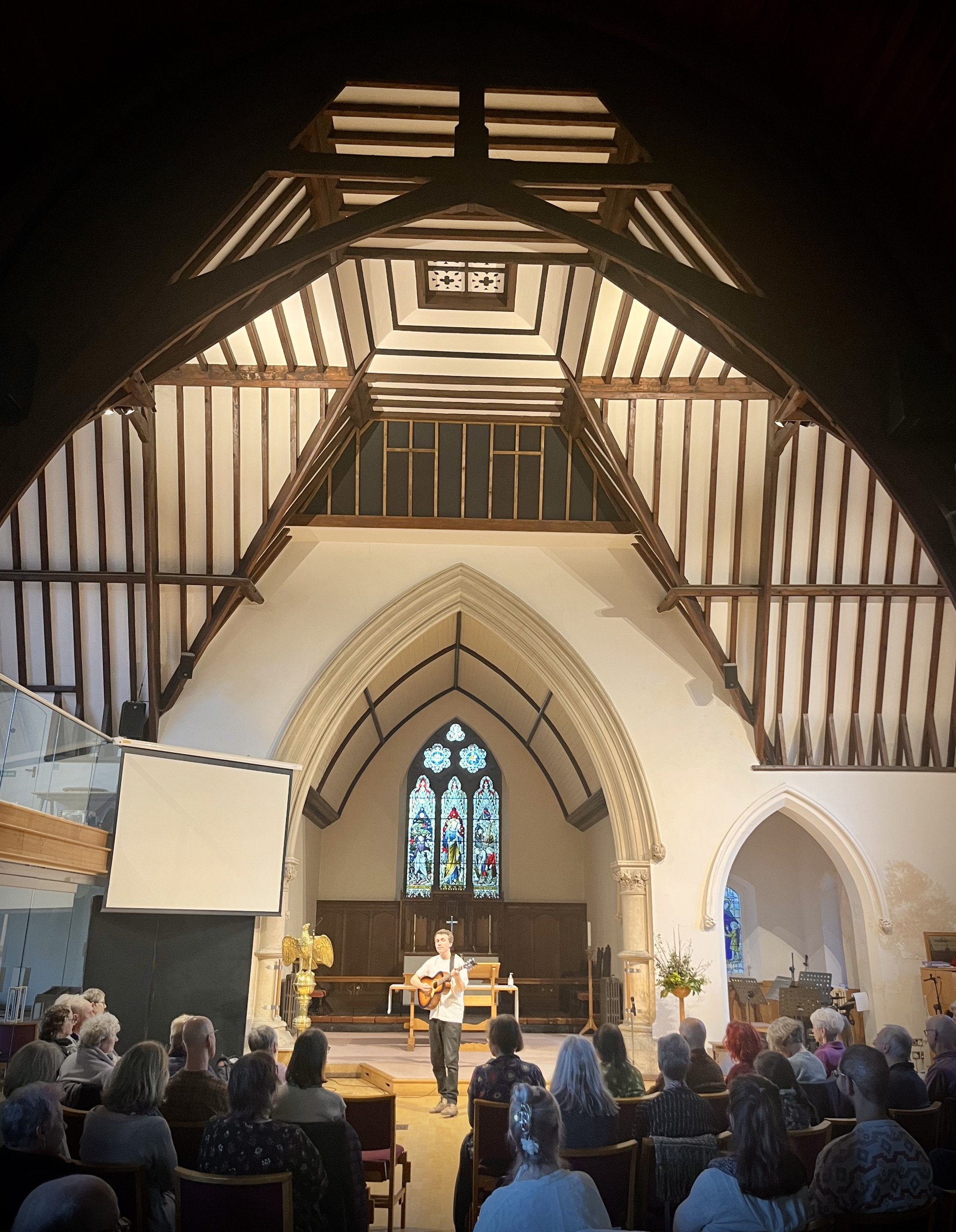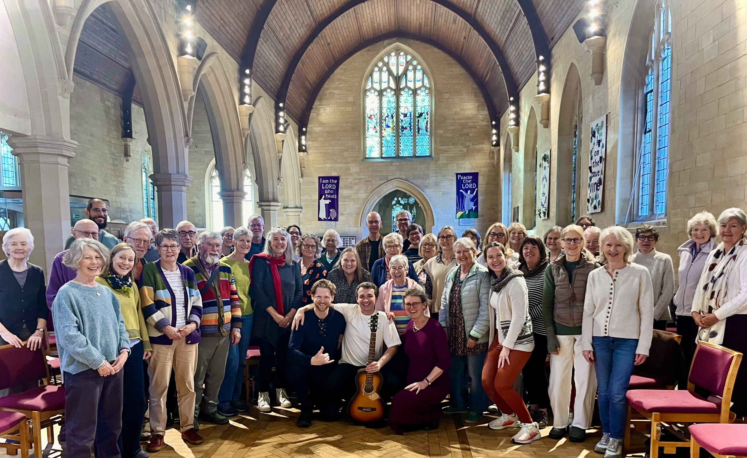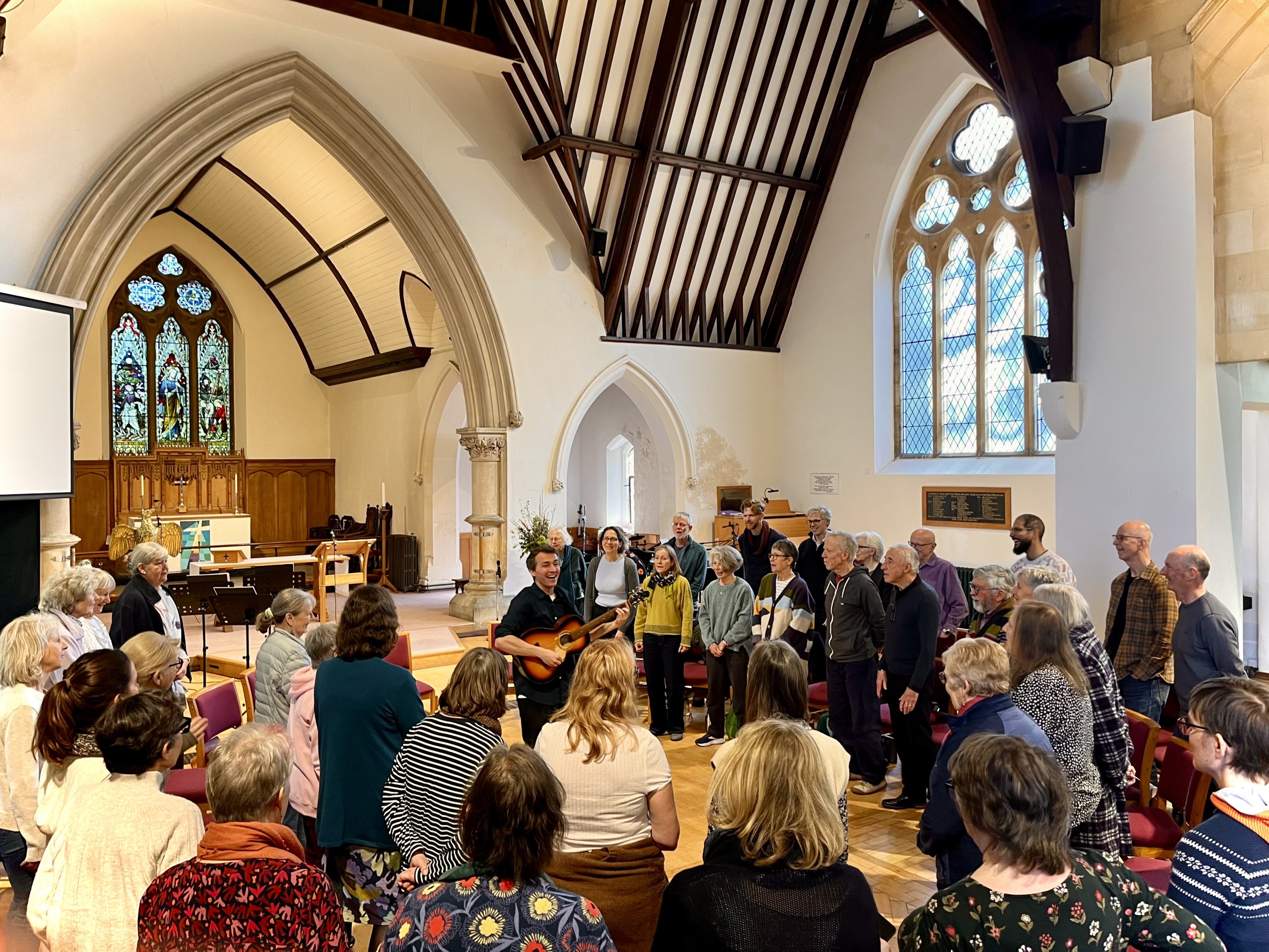 We were delighted to host Luke Wallace from Vancouver in Bath for a singing workshop and concert. Nearly fifty singers from near and far enjoyed a wonderful day of song, including two all the way from Germany. Luke taught a wonderful range of his own original songs, with compelling lyrics and rich choruses. Jane Harris co-taught and supported the harmony parts throughout the day, helping the songs to come together quickly and the harmonies to lock in. We also enjoyed songs by some of Luke’s favourite eco songwriters and rounded off the day by becoming the audience for a concert by Luke, with more singing of course…