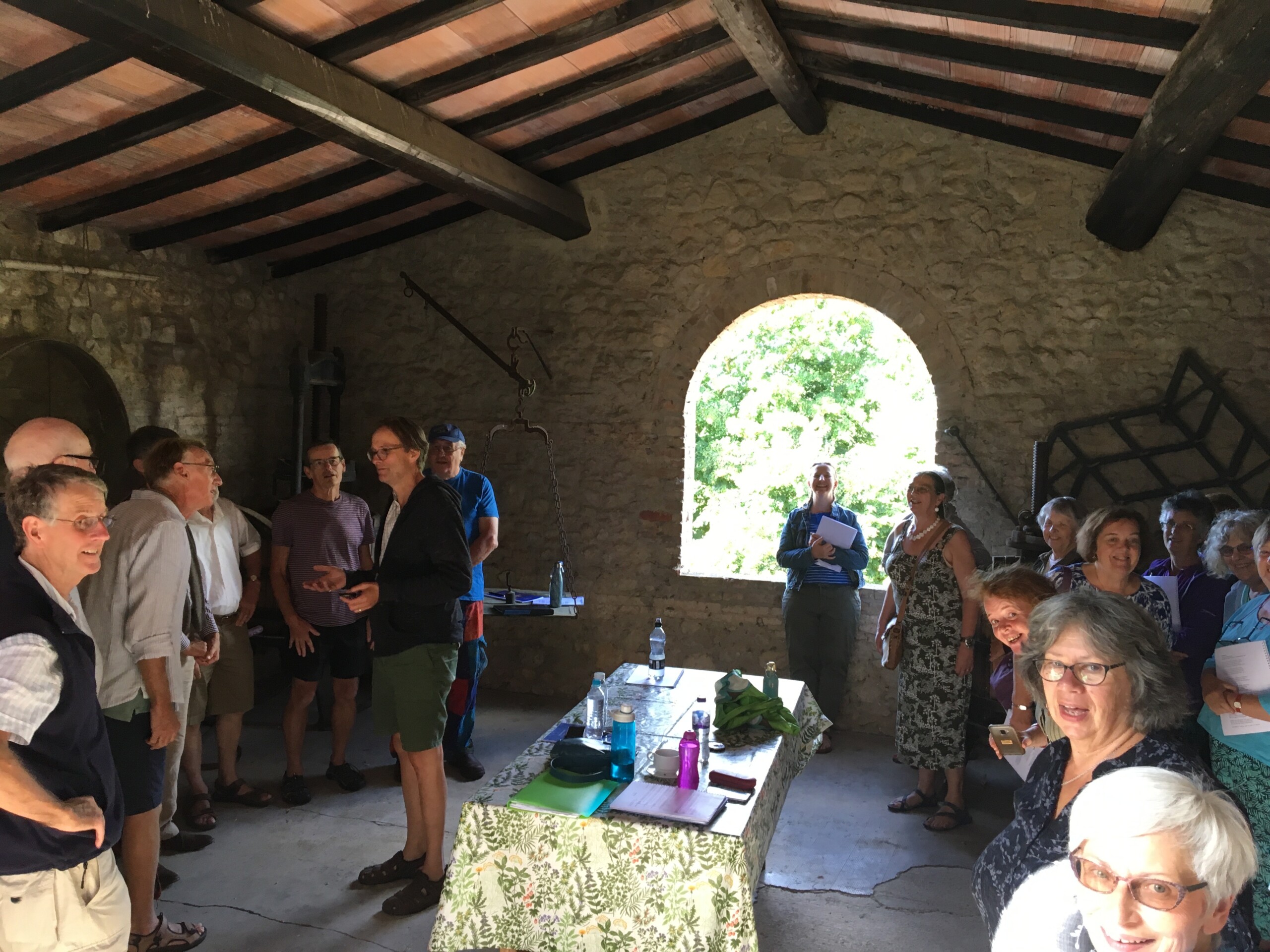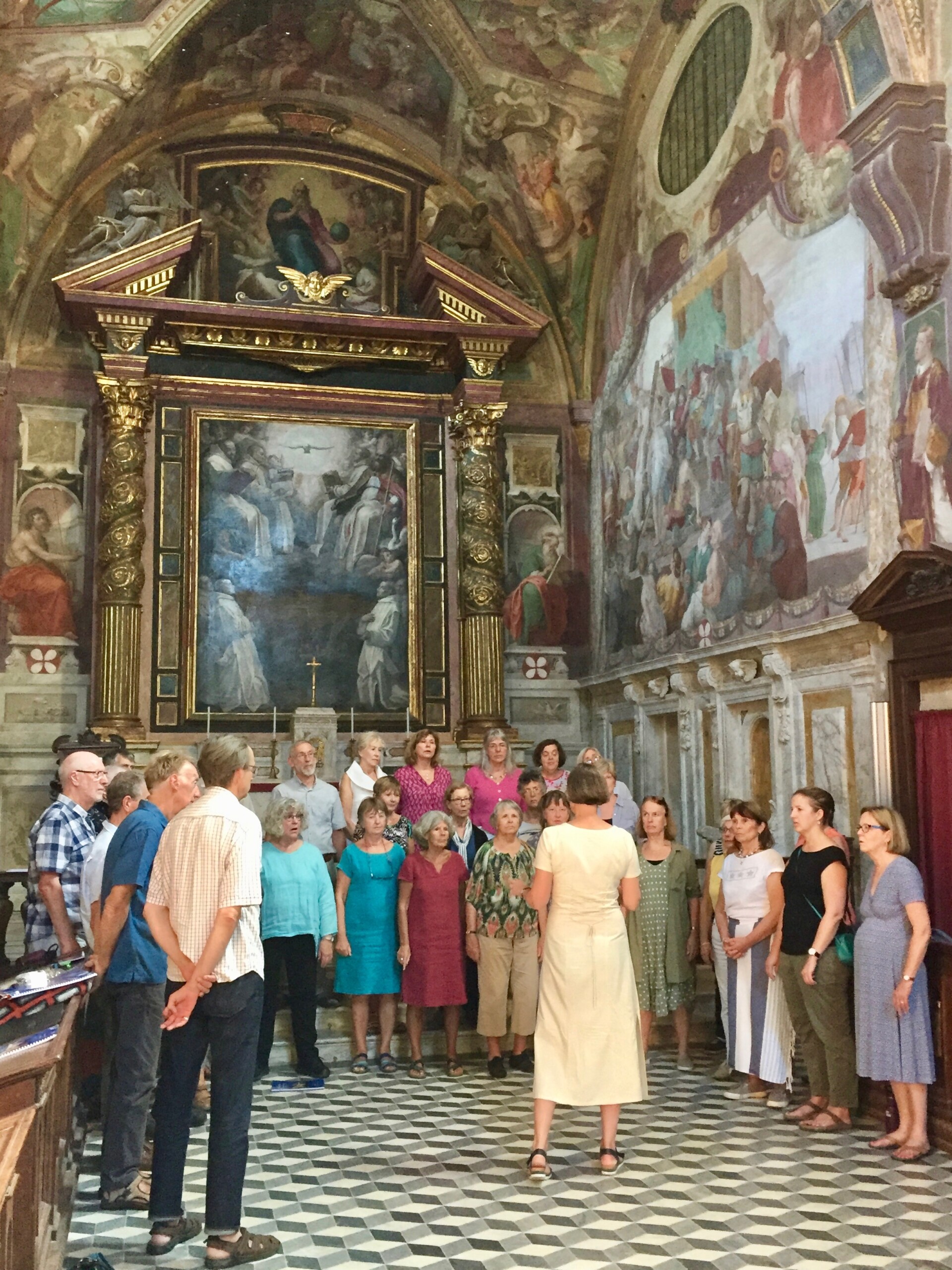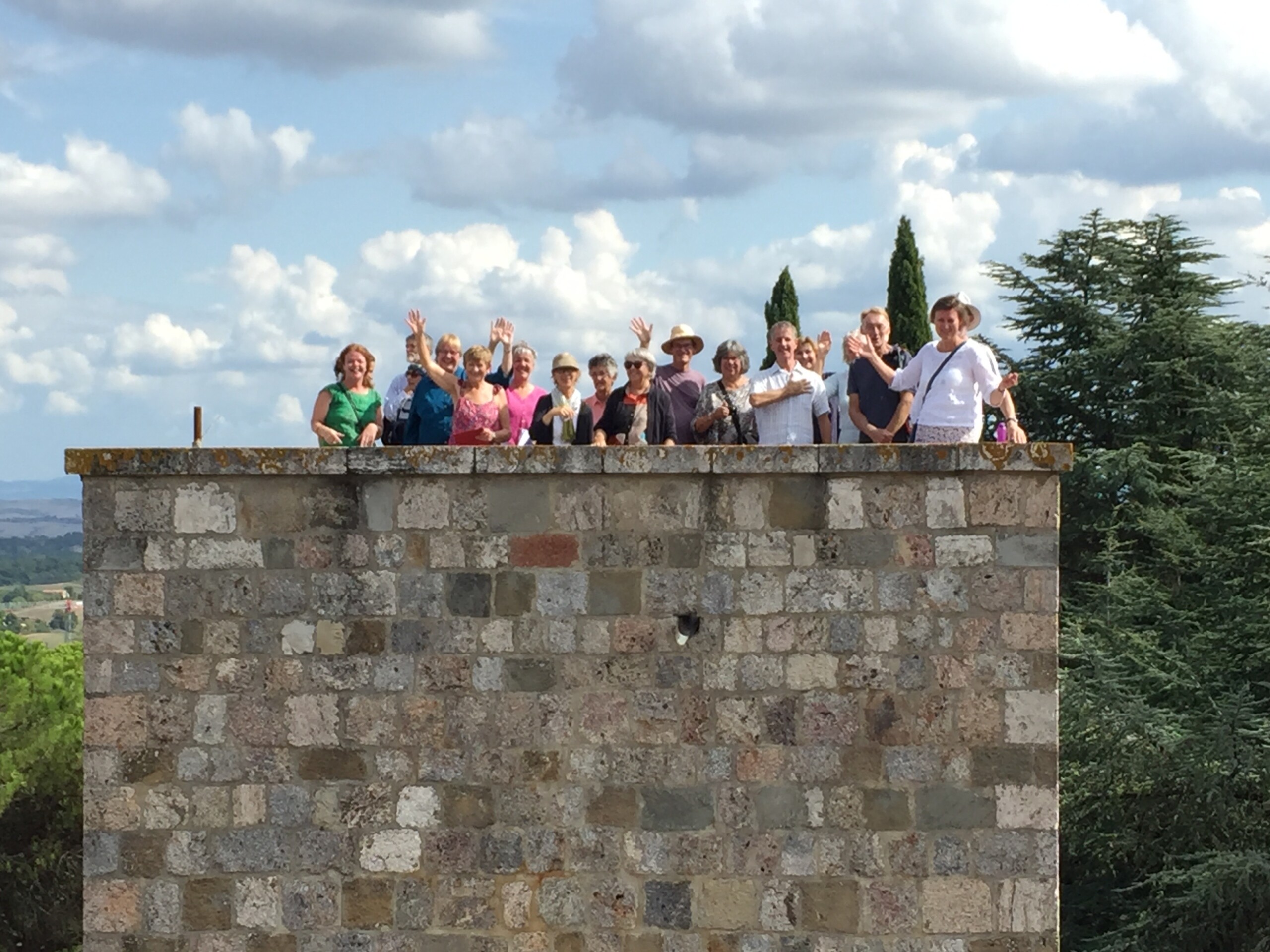 Jane and John taught a wide range of songs from different harmony singing traditions – including evocative folk songs, songs of stillness and beauty, classical gospel, South African, Tanzanian, Cajun, American shape note, a haunting Italian folk song and their own original compositions. We were thrilled to climb the 8th century tower with the owners of Le Tolfe, and to sing across to each other over the Tuscan hills. We also enjoyed a magical moonlit evening with two superb Sienese folk singers and musicians, who shared beautiful local folk songs and then joined us singing our songs and improvising on the mandolin with Jane on her violin. On our final afternoon we sang in the stunning 16th century chapel at Pontignano, with its extraordinary acoustics and incredible frescoes.