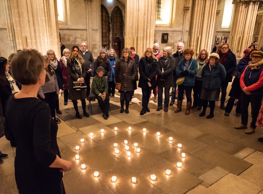 We began the evening gathered in the open Nave, filling the cathedral with sound and listening to the amazing harmonics created in the soaring space. Jane then taught Sing Hosanna, a simple melody composed specially for the event, which we sang from end to end of the Nave, interweaving our voices as we walked towards each other. This was followed by Shine on me, a powerful gospel song arranged by Tony Backhouse from Sydney, with fabulous harmonies. After a break we moved to the Chapter House, gradually filling it with an ethereal soundscape, with singers immersed in the group sound. Jane’s song In beauty may I stand was the final song of the evening, first in the Chapter House and then ending gathered around a pool of candlelight back in the Nave.